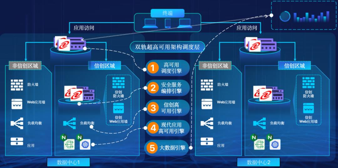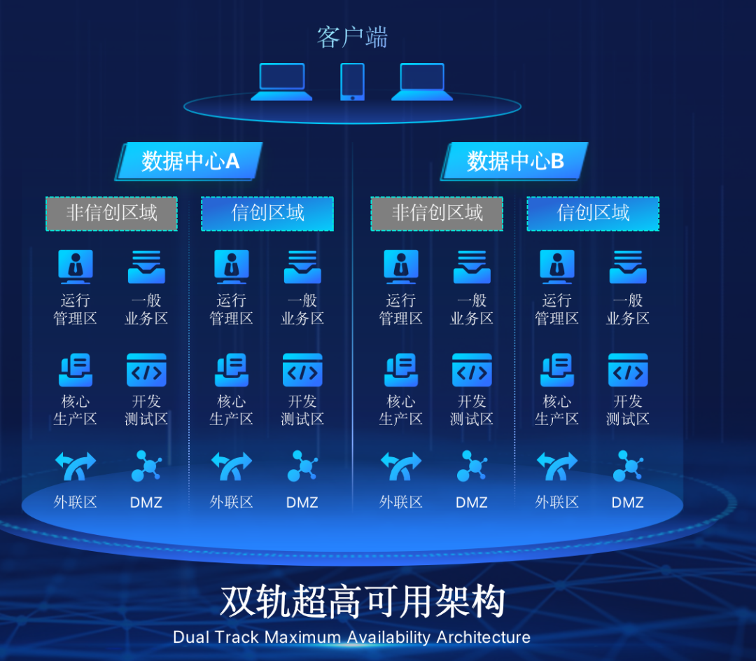 kaiyun.com在企业面临自主创新IT基础重构过程中,推出的全新架构双轨超高可用架构(简称DTMAA),在双活数据中心的分区调度基础上,添加每个数据中心内信创域和非信创域的分域调度,来实现分区分域协同的多活双轨超高可用。
